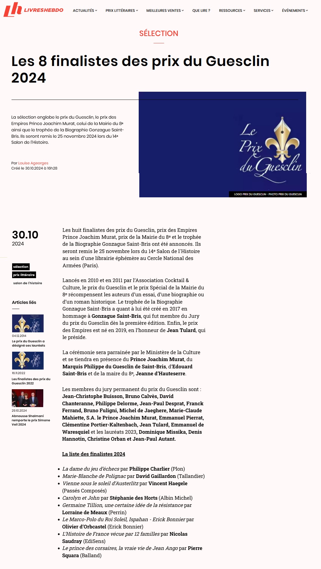 Le Prix du Guesclin, le Trophée de la Biographie Gonzague Saint-Bris et le Prix des Empires Prince Joachim Murat seront décernés vers 20h30 en présence de Joachim Murat, Prince de Contecorvo, Philippe du Guesclin, Marquis de Saint-Gilles et d’Edouard Saint-Bris.