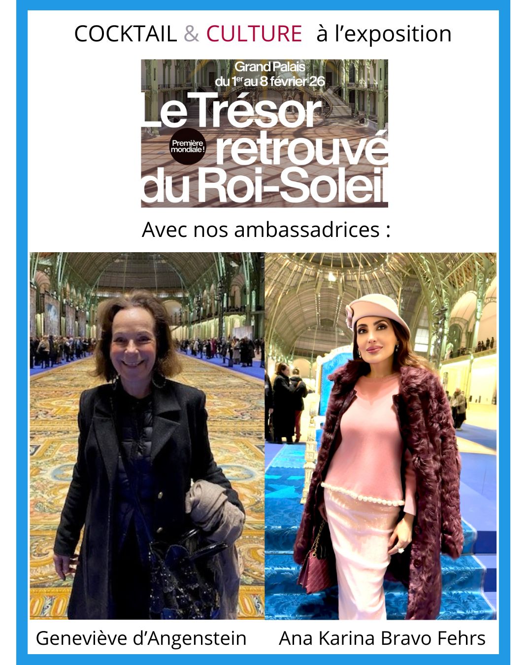 Nos ambassadrices Geneviève d’Angenstein et Ana Karina Bravo Fehrs ont représenté Cocktail & Culture à l’inauguration de l’exposition « Le Trésor retrouvé du Roi Soleil » au Grand Palais le 2 février 2026.