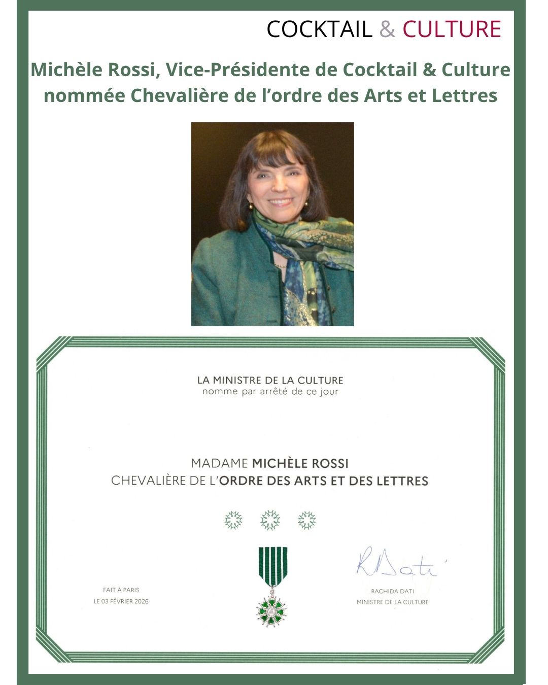 Notre vice-présidente, Michèle Rossi, a eu l’honneur de se voir décerner, au titre de la promotion d’hiver 2026, le grade de Chevalière de l’ordre des Arts et Lettres par Madame la Ministre Rachida Dati.
