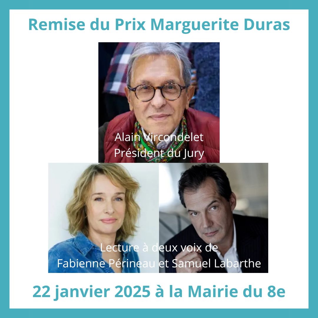 Le Prix Marguerite Duras 2025 sera remis mercredi 22 janvier par Jeanne d’Hauteserre à la Mairie du 8e et le président du Jury, Alain Vircondelet