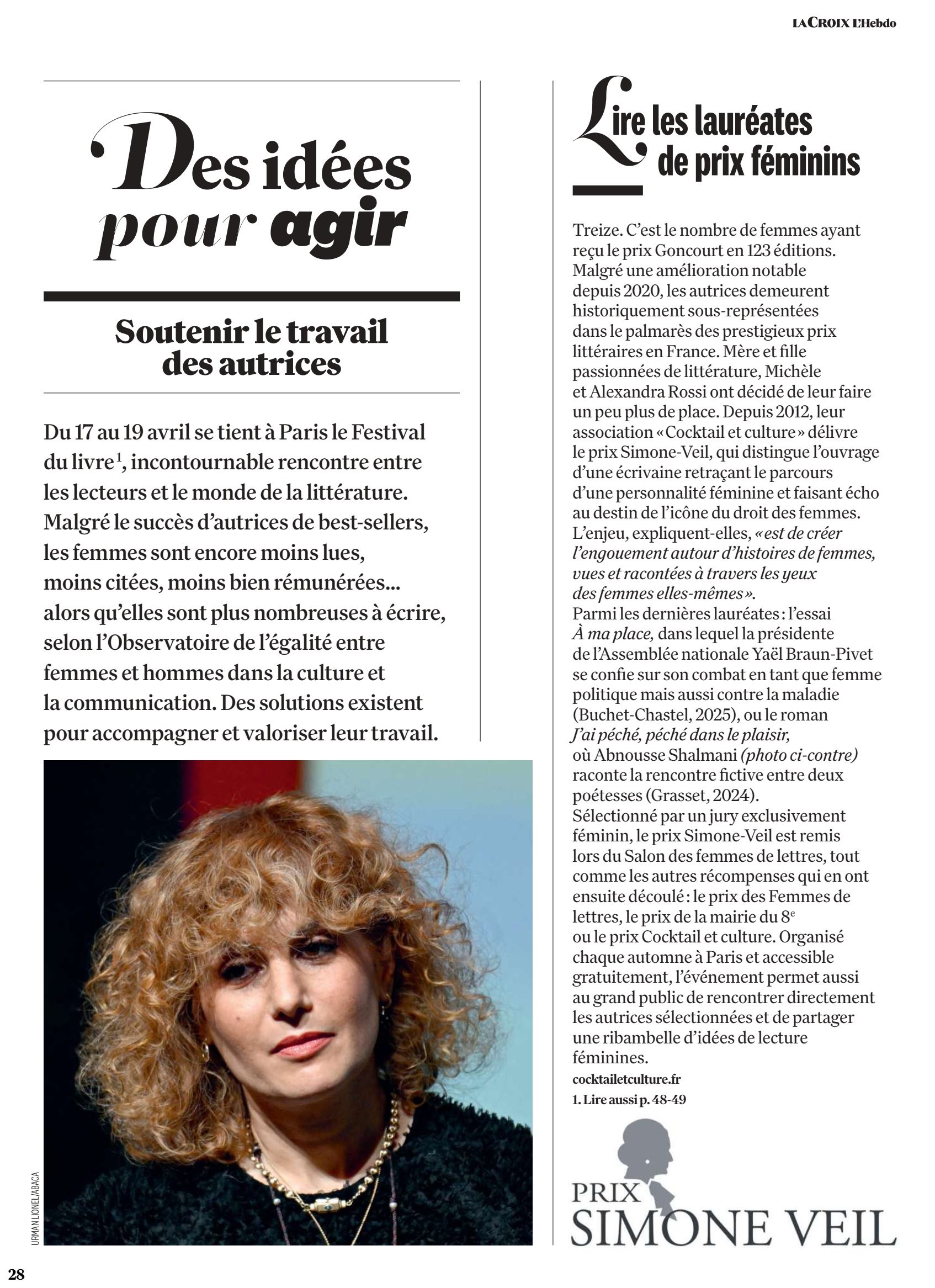 Revue de Presse – Le Prix Simone Veil et Cocktail & Culture dans La Croix Hebdo d’avril 2026